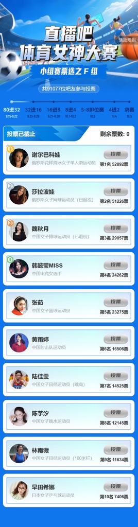 ①谢尔巴科娃(52892票)、②莎拉波娃(51226票)、③魏秋月(29057票)、④韩懿莹Miss(24262票)。