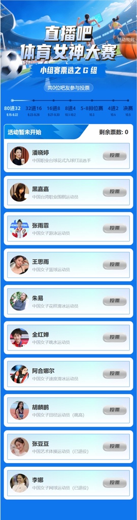 本次小组赛共分为8个小组,每组10名候选者,共80位体育女神参与角逐。