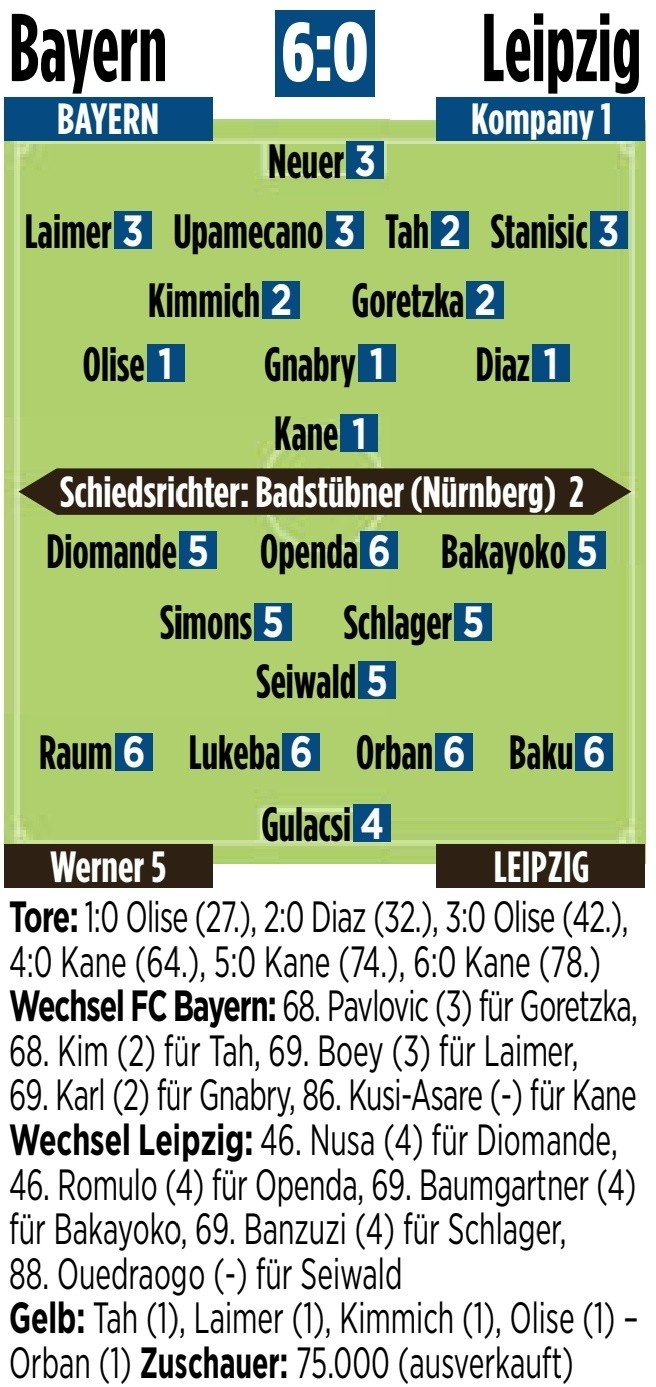 8月23日讯 德甲首轮比赛,拜仁主场6-0击败莱比锡,《图片报》对两队球员和教练进行了评分,凯恩、迪亚斯、格纳布里、奥利塞1分最高。
